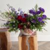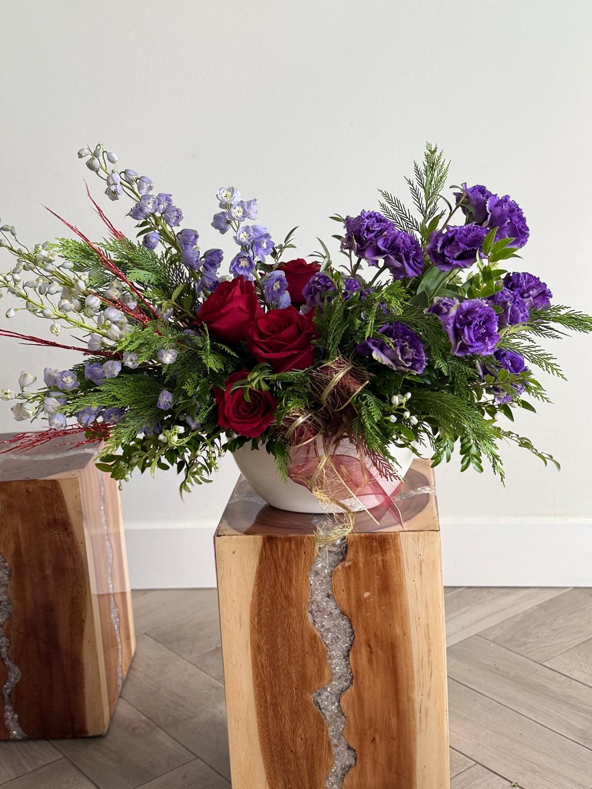 This is a large, full, and professionally designed arrangement featuring premium flowers like deep red roses , delicate delphiniums and abundant greenery.